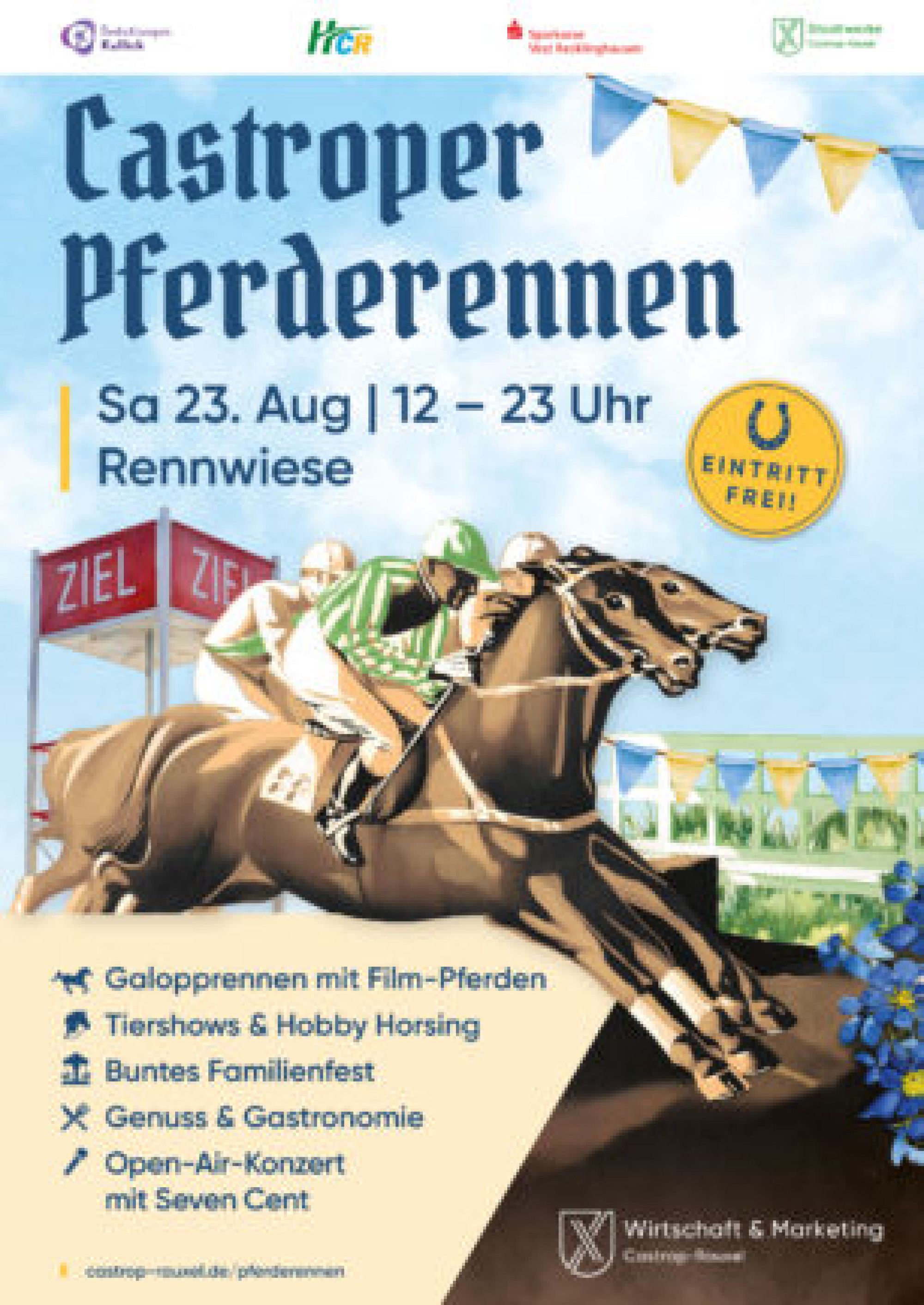 Erstmals darf das geneigte Rennpublikum in diesem Jahr auf der „Castroper Kurzstrecke“ Hobby-Reiterinnen und -Reiter bei einem echten Galopprennen anfeuern. Außerdem locken viele Kinderattraktionen, spannend inszenierte Pferderennen, Vereinsaktionen, Tiershows, ein vielfältiges gastronomisches Angebot und ein mitreißendes Konzert von Seven Cent vor einmaliger Kulisse am 23. August von 12.00 bis 23.00 Uhr auf die Rennwiese.